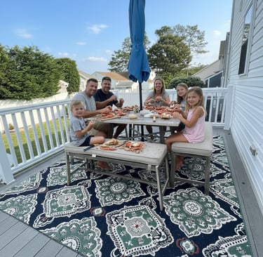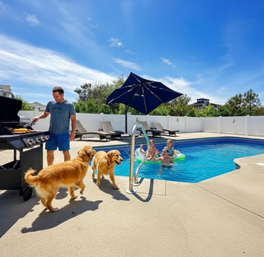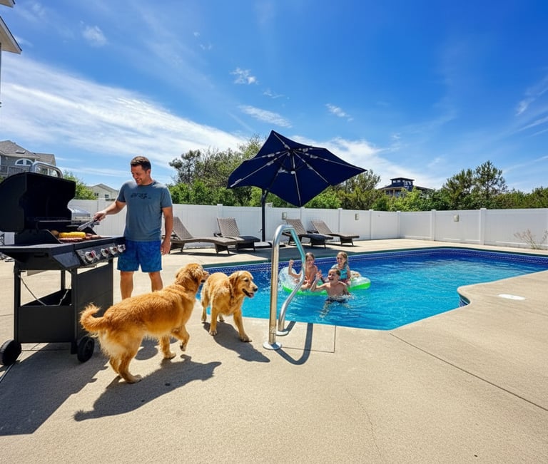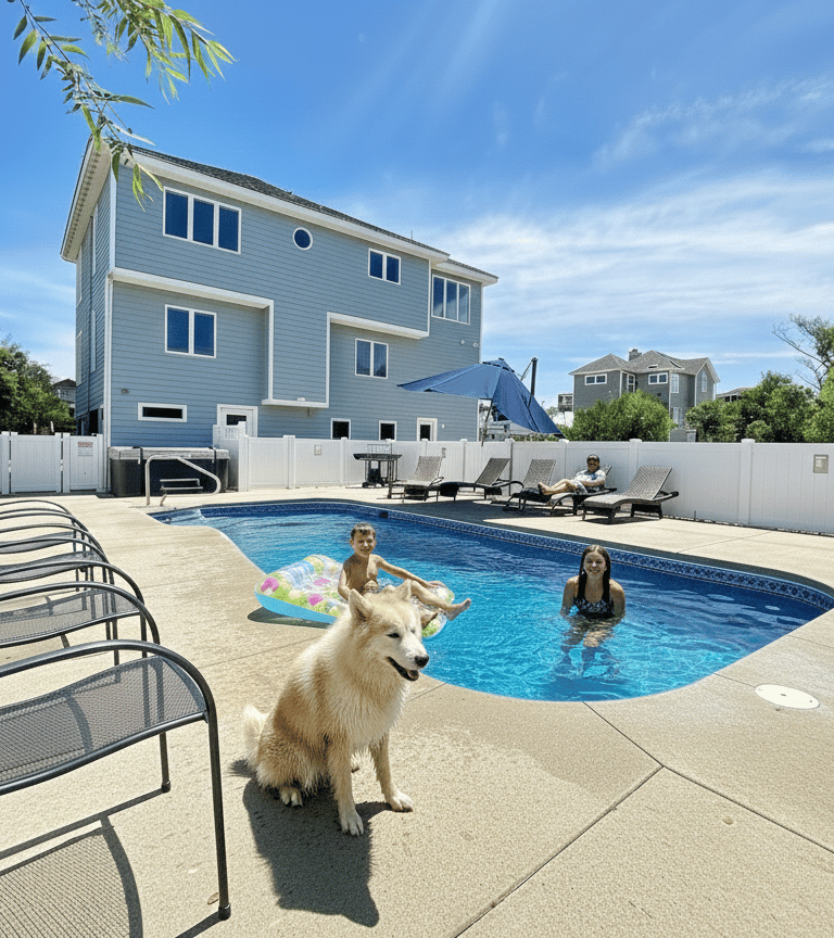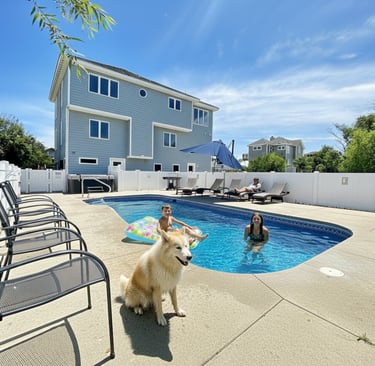 My family (son, daughter, their spouses, and two teenage girls, and the dog) thoroughly enjoyed our stay at Lazy Dog. The kitchen is very well equipped , there's plenty of seating for a large group, and space to spread out. Access to the beach is only a short walk away, and the beach itself is great with a gradual drop before reaching a large sandbar -- perfect for wave riding. The lot is much bigger than average, providing play space for the dog. And the pool is beautiful. All in all, a great stay.